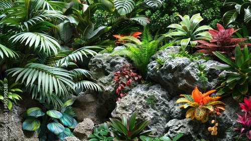 Fototapeta premium Tropical plants and rocks in a landscape setting.