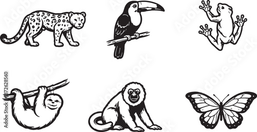 Fototapeta premium Tropical rainforest animals black and white line art icon set eps