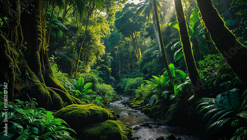 Obraz premium Tropical rainforest river flowing through lush green vegetation