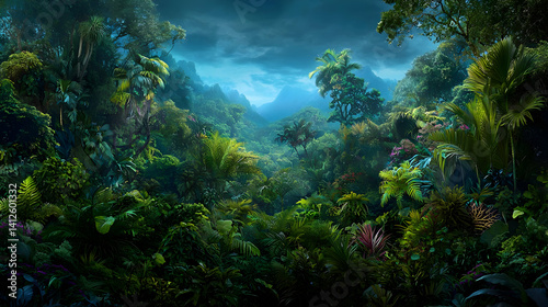 © artzone, Fototapeta premium Tropical Rainforest Valley At Dusk