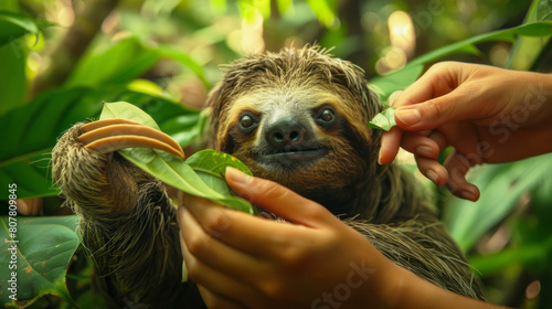© imagemir, Obraz premium Tropical rainforest with hands offering a leafy treat to a curious sloth