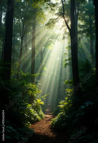 © Edwin, Obraz premium Tropical rainforest with sunlight filtering through the trees
