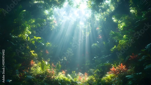 © Davy, Obraz premium tropical rainforest with vibrant green trees, rays of light streaming through the canopy
