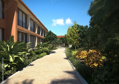 Fototapeta premium Tropical Resort Courtyard with Stone Path and Lush Greenery