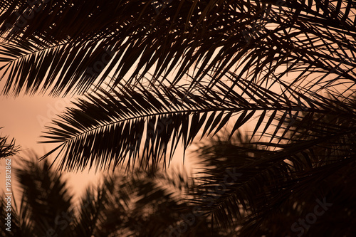 © antgor, Obraz premium Tropical resort, silhouette of palm tree branches against sky background