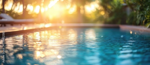 © Rizvan, Fototapeta premium tropical resort swimming pool at sunrise with soft focus on water and lush greenery in the background creating a serene atmosphere