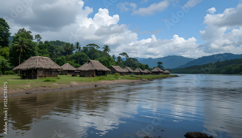© Rocky, Fototapeta premium Tropical Riverfront Huts: Paradise Found