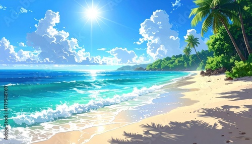 Fototapeta premium Tropical Sandy Beach with Turquoise Water and Palm Trees Under Bright Sunny Sky