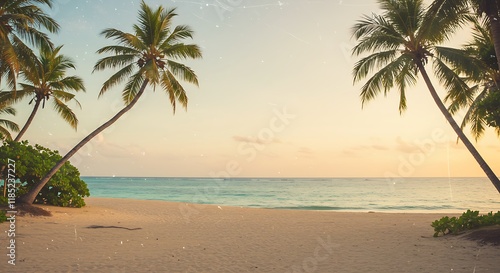 Obraz premium Tropical sandy ocean beach with palm trees vintage toned with film distress...
