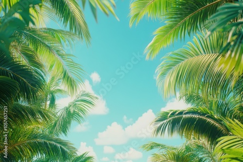 © Nico, Naklejka premium Tropical Scene with Lush Palm Leaves and Clear Sky