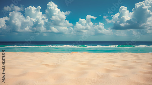 Fototapeta premium Tropical sea sand sky, closeup beach scene. Idyllic peaceful horizon calm waves seascape, beautiful beach with white sand, turquoise ocean and sunny sky clouds in sunny day. Summer travel vacations