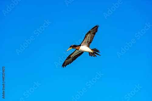 © Fred Pinheiro, Obraz premium Tropical seabird flying with open wings and blue sky behind