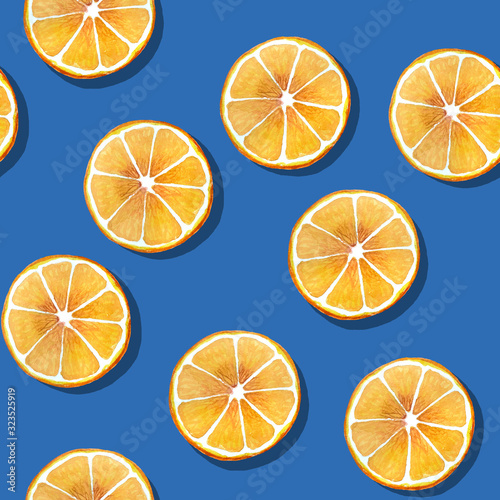 Fototapeta premium Tropical seamless pattern with orange slices. Watercolor illustration on blue background for scrapbooking, wallpaper, packaging, textiles