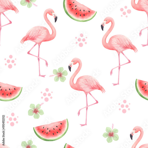 Obraz premium Tropical Seamless Pattern with Pink Flamingos and Watermelon Slices