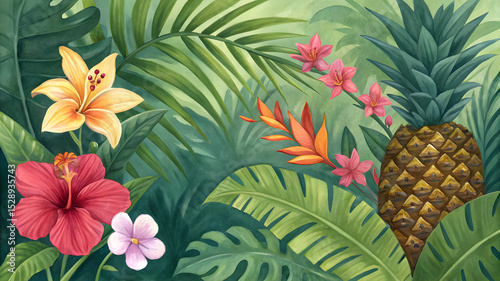 © Lphasrada, Naklejka premium Tropical Set. Exotic flower hibiscus, orchid, monstera palm leaf and pineapple, ripe fruit. Jungle watercolor painting