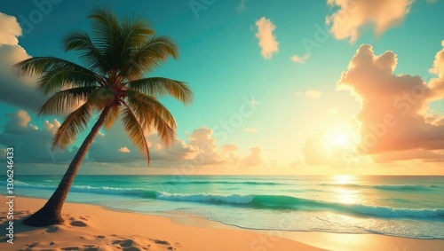 Fototapeta premium tropical shore with a coconut palm tree at sunset