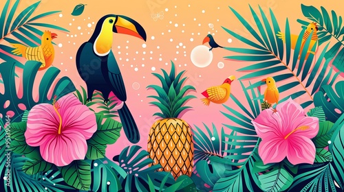 © Pattarin, Naklejka premium Tropical summer beach patchwork seamless pattern. Vector jungle palm tree, leopard, doodle elements, stripes, polka dots, toucan bird, pineapple. Cute exotic print, hawaii background, wallpaper