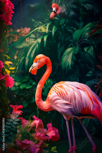 © Ljuba3dArt, Fototapeta premium Tropical summer pink background with palm leaf, exotic animal concept. Flamingo, wild beautiful animal. Illustration, Generative AI.