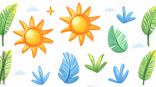 Fototapeta premium Tropical summer sun, leaves pattern, white background; ideal for summer designs