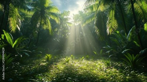 Fototapeta premium Tropical Sunlight Piercing Lush Jungle Floor