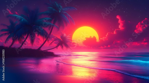© Siasart, Naklejka premium Tropical Sunset Beach Scene - Digital Illustration