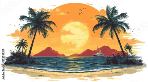 Fototapeta premium Tropical sunset beach scene with palm trees, ocean, and yacht.