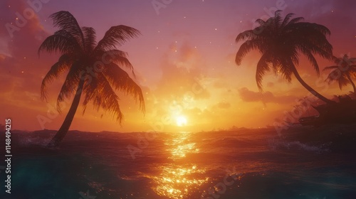 © Berkah1789, Obraz premium Tropical Sunset Ocean Scene With Palm Trees