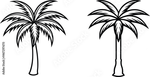 Obraz premium Tropical Sunset Palm Tree Silhouette Set – Beach Landscape Vector Collection, Black Palm Tree Silhouette Icons Set – Tropical Beach Vector Collection, summer silhouette vector icon set.