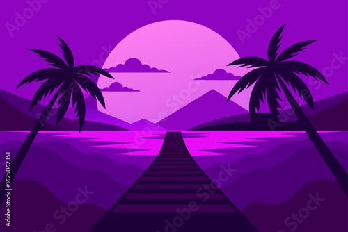© Provati, Fototapeta premium Tropical sunset with palm trees and a pier over the ocean
