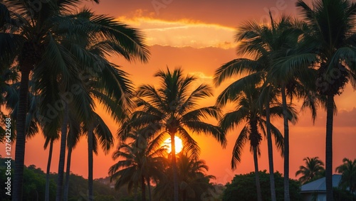 Obraz premium Tropical sunset with palm trees silhouetted against a vibrant orange and...