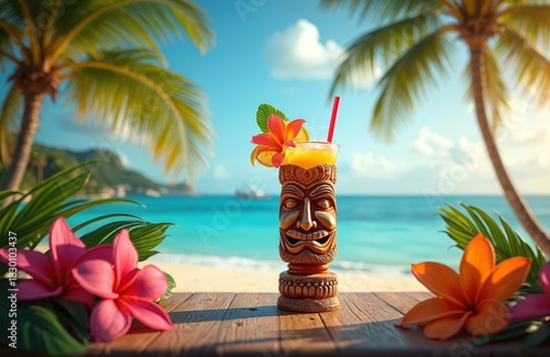 © Maryna, Naklejka premium Tropical tiki bar with ocean view. Cocktail with fruit and straw sits on wooden table. Palm trees and flowers frame beachside paradise scene. Refreshing drink.