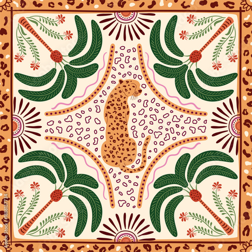 © Tani Kuzminka, Fototapeta premium Tropical tile, scarf, square seamless pattern with palm tree, leopard, sun, jaguar skin spots, geometric elements. Hand drawn summer beach print, jungle textile design, vector repeat background