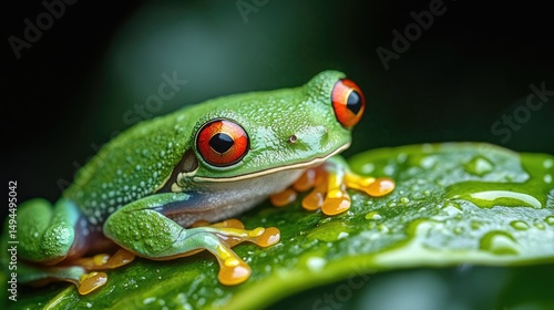 Obraz premium Tropical Tree Frog on Leaf, Rainforest, Close-up, Dew Drops