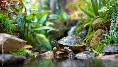 © Faqih, Fototapeta premium Tropical turtle tank with a waterfall and lush greenery