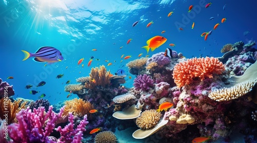 Fototapeta premium Tropical underwater sea life at bright and colorful Coral reef landscape ai...