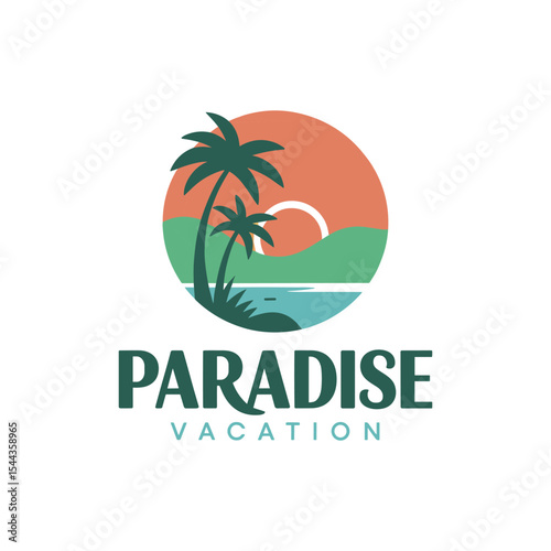 Naklejka premium Tropical Vacation Logo – Sunset Beach and Palm Tree Icon for Travel Agency,...