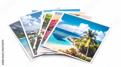 Fototapeta premium Tropical vacation photos displayed, showcasing beach, ocean, and island scenery; ideal for travel agency advertising
