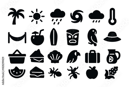 Fototapeta premium Tropical vacation silhouette icons set – solid style beach, sun, and...