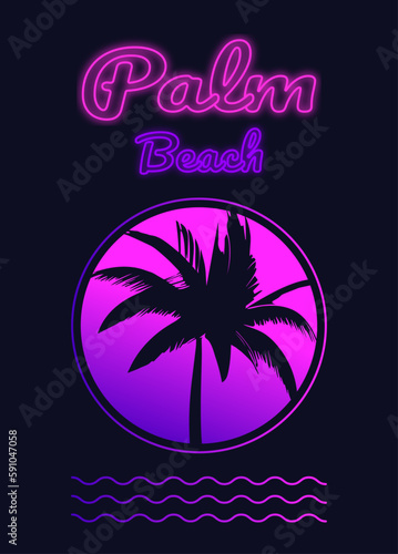 © Katya, Fototapeta premium Tropical vector illustration of a poster with a palm tree. Neon text Palm beach. Trending neon gradient.
