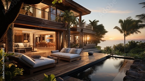 Fototapeta premium Tropical villa view with garden and open living room at sunset