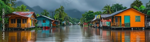 Naklejka premium Tropical village street under heavy rain, vivid colors of the houses contrasting with the grey sky and reflective water, capturing the essence of monsoon season