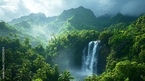 © pisto graph, Fototapeta premium Tropical waterfall cascades through lush foliage