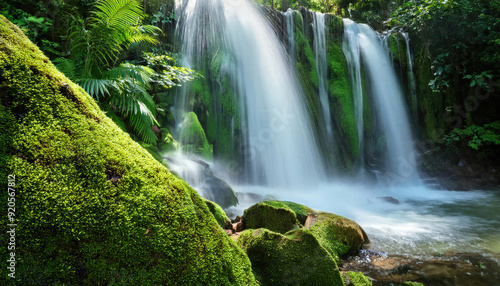 Obraz premium Tropical waterfall in the forest cascading over wet moss rocks with green...