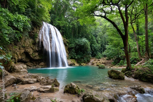 Fototapeta premium Tropical waterfall into a vivid turquoise pool, lush green jungle.