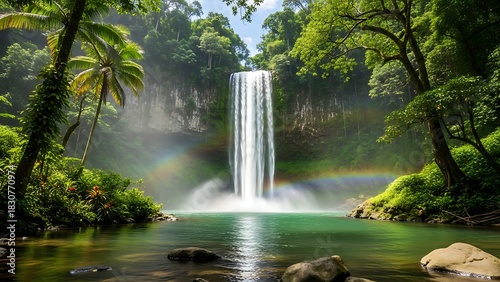 Obraz premium Tropical Waterfall Oasis Lush Greenery, Rainbow Mist, and Crystal-Clear Waters