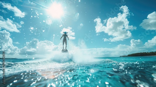 Obraz premium Tropical Watersports Adventure: A Flyboard Soars Above Azure Waves