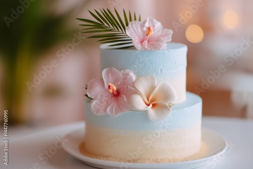© World of AI, Fototapeta premium Tropical Wedding Cake with Hibiscus and Plumeria Flowers