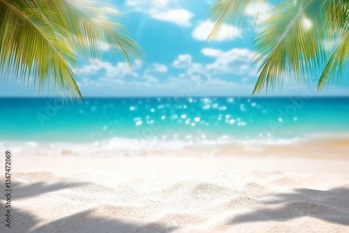© SEUNGJIN, Fototapeta premium Tropical white sand beach Summer background with green palm leaf