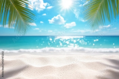 © SEUNGJIN, Fototapeta premium Tropical white sand beach Summer background with green palm leaf
