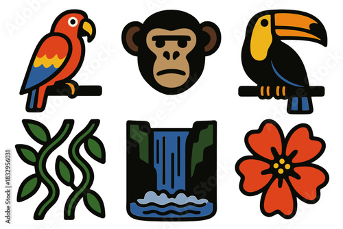 Naklejka premium Tropical Wildlife Icons. Tropical Wildlife silhouette icon set: parrot, monkey, toucan, waterfall, vines, bright flower